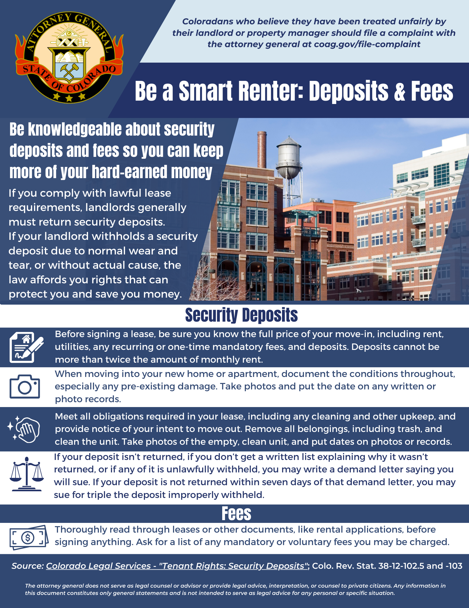 Under Colorado law, landlords cannot charge residents fees that aren’t disclosed in lease agreements. State law also bars landlords from keeping security deposits to pay for normal wear and tear in their units.