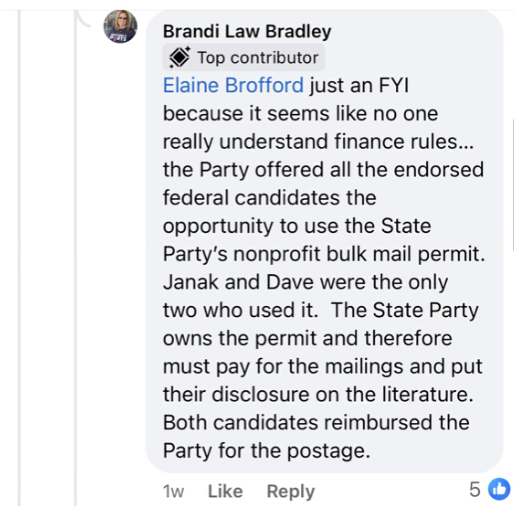 State Rep. Brandi Bradley, a Republican ally of Williams, posted on Facebook that the party offered all of the federal candidates it endorsed access to the state’s discounted postage permit and that both Williams and Joshi “reimbursed the party for the postage.”