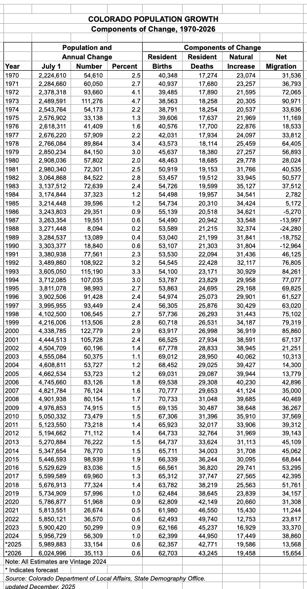 Population data shows an estimated 320,000 people migrated to Colorado from 2016-2025. During that period, natural population growth — or the difference between births and deaths — added about 210,000 people. Net migration dipped below natural population growth twice in that time frame, in 2021 and 2025.